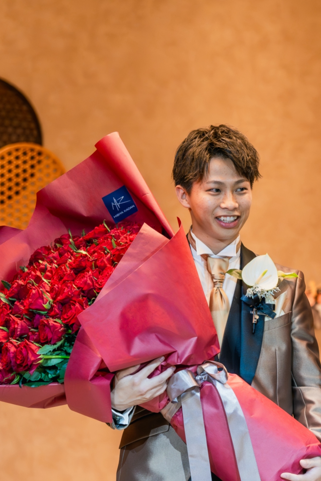 腕一杯に真っ赤なバラを抱えた彼が立っていて